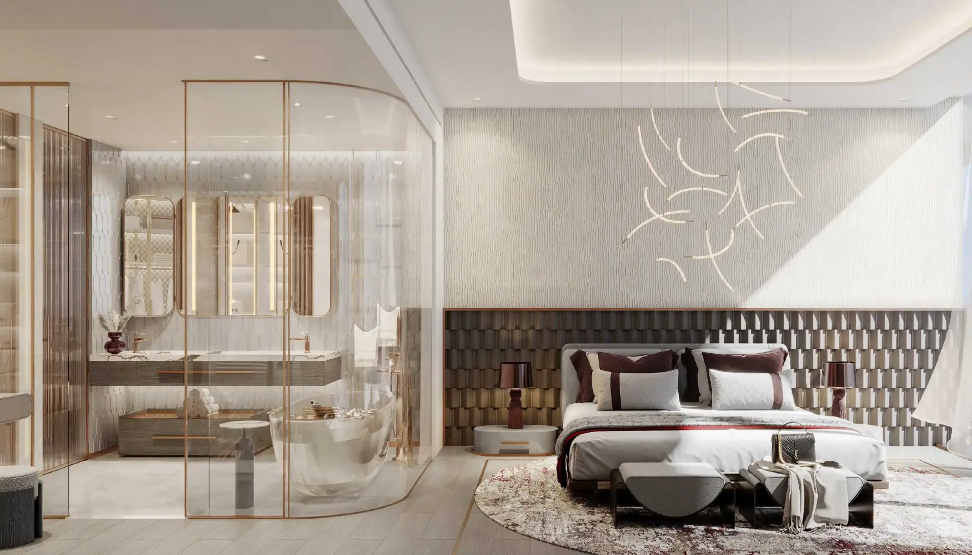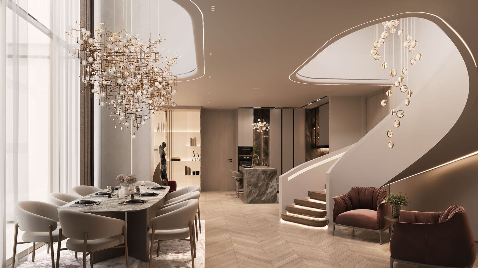 Interiors are designed in a light palette with open-plan layouts, fully furnished spaces, and premium materials